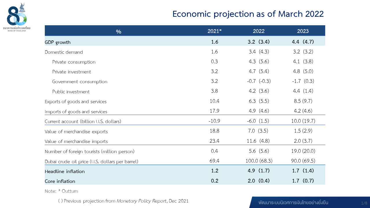 The Committee assesses that the Thai economy will continue to grow at the rate of 3.2 percent in 2022 and 4.4 percent in 2023 on the back of improving domestic demand and tourism. The impact of the Omicron variant outbreak on economic activities is expected to be more contained than previous waves. Sanctions against Russia have pushed the cost of goods higher but will not derail the overall recovery path. Nonetheless, downside risks to growth remain, including (1) prolonged shortages of raw materials in certain industries and (2) the impact of higher prices on living costs for households and production costs for businesses, particularly toward vulnerable groups. The Committee will closely monitor developments in the abovementioned situations closely.
