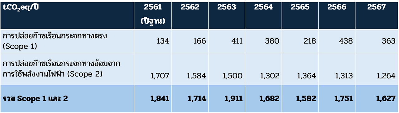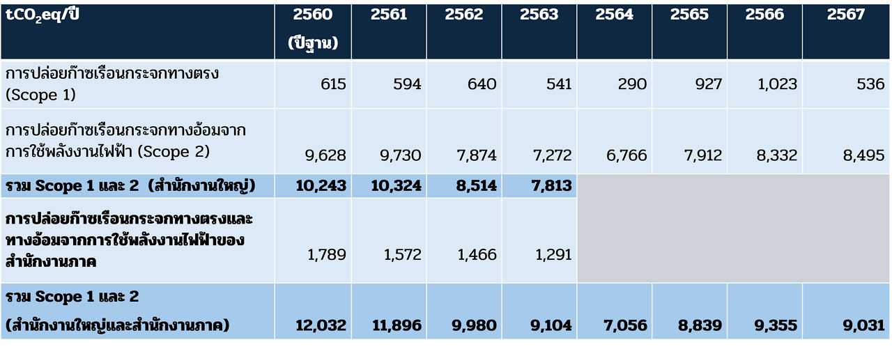 ธปท. ได้จัดทำตัวชี้วัดการดำเนินงานของ ธปท. เพื่อติดตามและประเมินผลสัมฤทธิ์ของนโยบายและมาตรการลดปริมาณการปล่อยก๊าซเรือนกระจกขอบเขตที่ 1-2 (Scope 1-2) ซึ่งมีการสอบทานและได้รับการรับรองผลการปล่อยก๊าซเรือนกระจกจากองค์การบริหารจัดการก๊าซเรือนกระจก (อบก.) เป็นประจำทุกปีโดยที่ ธปท. ได้ตั้งเป้าหมายการลดการปล่อยก๊าซเรือนกระจก Scope 1-2 สำหรับสำนักงานใหญ่และสำนักงานภาค1และสำนักงานที่ดูแลการผลิตและบริหารจัดการธนบัตร2 ให้ได้อย่างน้อยร้อยละ 30 ภายในปี 2573 เทียบกับปี 2560 และเทียบกับปี 2561 ตามลำดับ โดยปี 2567 ธปท. สามารถลดปริมาณการปล่อยก๊าซเรือนกระจกลงได้ร้อยละ 25 และร้อยละ 10 ตามลำดับเมื่อเทียบกับปีฐาน