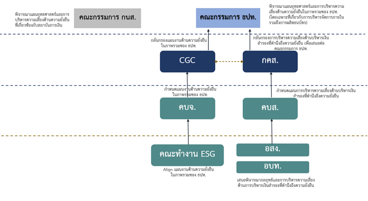 ธปท. มีโครงสร้างการกำกับดูแลนโยบายและแนวทางการขับเคลื่อนการดำเนินการที่เกี่ยวข้องกับการเปลี่ยนแปลงสภาพภูมิอากาศและสิ่งแวดล้อมทั้งบทบาทตามพันธกิจและการดำเนินกิจการ ในส่วนของพันธกิจ มีคณะกรรมการนโยบายสถาบันการเงิน (กนส.) ประกอบด้วยผู้บริหารของ ธปท. และกรรมการจากภายนอก ทำหน้าที่กำหนดนโยบายเกี่ยวกับการกำกับและตรวจสอบสถาบันการเงิน และวางแนวทางการพัฒนาภูมิทัศน์ภาคการเงินไทยซึ่งรวมถึงดูแลภาพรวมให้ระบบการเงินของไทยสนับสนุนการเปลี่ยนผ่านของภาคธุรกิจไปสู่่การเติบโตอย่างยั่งยืน ในส่วนของการดำเนินกิจการ มีคณะกรรมการ ธปท. ประกอบด้วยผู้บริหารของ ธปท. และกรรมการจากภายนอก ทำหน้าที่ควบคุมดูแลโดยทั่วไปซึ่งกิจการและการดำเนินการของ ธปท. รวมถึงการดำเนินการด้านสิ่งแวดล้อม โดยมีคณะกรรมการธรรมาภิบาล (CGC) พิจารณากลั่นกรองแผนงานสำคัญด้านสิ่งแวดล้อมในภาพรวมของ ธปท. และคณะกรรมการบริหารจัดการ (คบจ.) กำหนดทิศทางภาพรวมการดำเนินงานภายในให้มีความเชื่อมโยงกันโดยได้จัดตั้งคณะทำงานเพื่อความยั่งยืน (คณะทำงาน ESG) เพื่อสนับสนุนการดำเนินงานดังกล่าว