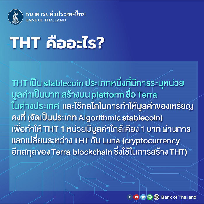 ตอบ : THT เป็น stablecoin ประเภทหนึ่งที่มีการระบุหน่วยมูลค่าเป็นบาท สร้างบน platform ชื่อ Terra ในต่างประเทศ และใช้กลไกในการทำให้มูลค่าของเหรียญคงที่ (จัดเป็นประเภท Algorithmic stablecoin) เพื่อทำให้ THT 1 หน่วยมีมูลค่าใกล้เคียง 1 บาท ผ่านการแลกเปลี่ยนระหว่าง THT กับ Luna (คริปโทเคอร์เรนซีอีกสกุลของ Terra blockchain ซึ่งใช้ในการสร้าง THT)