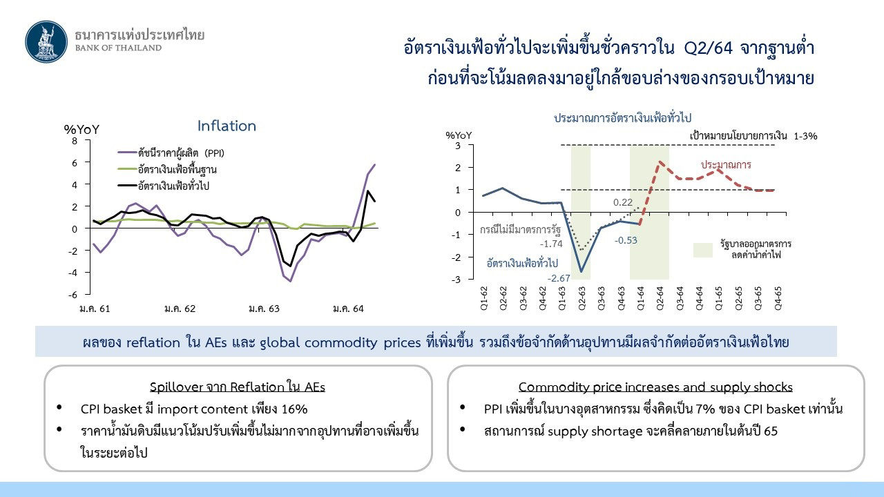 เศรษฐกิจไทยมีแนวโน้มขยายตัวร้อยละ 1.8 และ 3.9 ในปี 2564 และ 2565 ตามลำดับ โดยปรับลดลงจากประมาณการเดิมตามแนวโน้มนักท่องเที่ยวต่างชาติที่ปรับลดลง และอุปสงค์ในประเทศที่ได้รับผลกระทบจากการระบาดระลอกที่สาม ด้านตลาดแรงงาน โดยเฉพาะภาคบริการและผู้ประกอบอาชีพอิสระมีความเปราะบางมากขึ้นและอาจฟื้นตัวได้ช้า อย่างไรก็ดี เศรษฐกิจไทยยังมีแรงสนับสนุนเพิ่มเติมจากแนวโน้มการใช้จ่ายภาครัฐที่สูงขึ้นจาก พ.ร.ก. กู้เงินล่าสุดและการส่งออกสินค้าที่ขยายตัวดีตามการฟื้นตัวของเศรษฐกิจโลก สำหรับอัตราเงินเฟ้อทั่วไปเร่งขึ้นชั่วคราวในไตรมาสที่ 2 ปี 2564 จากฐานราคาน้ำมันดิบที่อยู่ในระดับต่ำในไตรมาสเดียวกันของปีก่อน ขณะที่การเพิ่มขึ้นของอัตราเงินเฟ้อในกลุ่มประเทศเศรษฐกิจหลักและข้อจำกัดด้านอุปทานมีผลจำกัดต่ออัตราเงินเฟ้อไทย ด้านการคาดการณ์อัตราเงินเฟ้อในระยะปานกลางยังยึดเหนี่ยวอยู่ในกรอบเป้าหมาย ทั้งนี้ เศรษฐกิจไทยในระยะข้างหน้ายังมีความเสี่ยงด้านต่ำอย่างมีนัยสำคัญ จากสถานการณ์การระบาดทั้งในและต่างประเทศที่มีแนวโน้มรุนแรงขึ้นจากการกลายพันธุ์ของไวรัส และจะส่งผลกระทบต่อจำนวนนักท่องเที่ยวต่างชาติรวมถึงกิจกรรมทางเศรษฐกิจในประเทศ ซึ่งคณะกรรมการจะติดตามประเด็นดังกล่าวอย่างใกล้ชิด