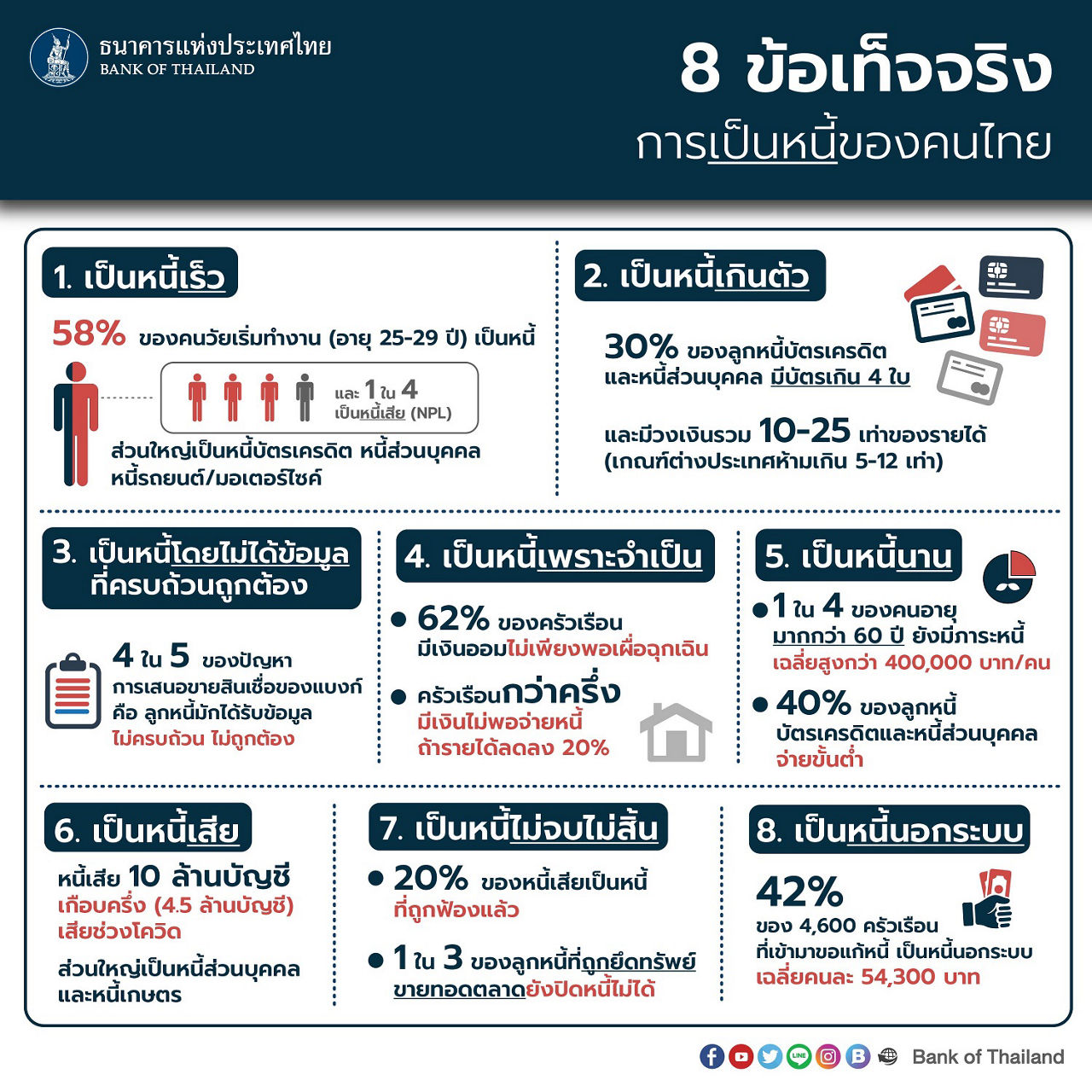 3. หนี้ใหม่ที่เพิ่มขึ้นเร็วและอาจเป็นหนี้เสียหรือเรื้อรังในอนาคต : ธปท. จะออกเกณฑ์เพื่อให้เจ้าหนี้ปล่อยสินเชื่อด้วยความรับผิดชอบ (responsible lending) และกำหนดให้เจ้าหนี้ปล่อยสินเชื่อโดยคำนึงถึงความสามารถในการจ่ายหนี้คืนและลูกหนี้ยังมีเงินเหลือพอดำรงชีพ (macroprudential policy) รวมถึงสร้างแรงจูงใจให้เจ้าหนี้สินเชื่อรายย่อยคิดอัตราดอกเบี้ยตามความเสี่ยงของลูกหนี้แต่ละราย (risk-based pricing) พร้อมผลักดันให้เจ้าหนี้อื่นเห็นพฤติกรรมดีของลูกหนี้ เพื่อกระตุ้นการรีไฟแนนซ์หนี้ไปยังดอกเบี้ยที่ถูกลง