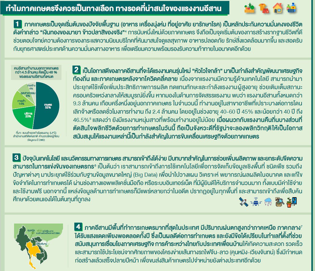 วิกฤติโควิด-19 ทำให้แรงงาน 8.4 ล้านคน ในกลุ่มธุรกิจภาคท่องเที่ยว ภาคอุตสาหกรรม และภาคบริการอื่นๆ มีความเสี่ยงถูกเลิกจ้าง เด็กจบใหม่กว่า 5 แสนคนหางานยาก1/ รวมถึงแรงงานกลับจากต่างประเทศด้วย คนกลุ่มนี้กว่า 40% เป็นแรงงานอีสาน2/สำหรับแรงงานและผู้ประกอบอาชีพอิสระแล้ว วิกฤติครั้งนี้จึงรุนแรงกว่าวิกฤติต้มยากุ้งปี 2540 นี่ยังไม่รวมว่า ในช่วงบังคับใช้มาตรการสกัดการแพร่ระบาดของโควิด-19 มีแรงงานอีสานที่ได้รับผลกระทบเดินทางกลับคืนถิ่นราว 800,000 คน3/ ซึ่งน่าคิดว่า เมื่อสถานการณ์คลี่คลาย หากแรงงานบางส่วนไม่สามารถกลับไปทำงานเดิมได้อีกแล้ว และตัดสินใจเริ่มต้นชีวิตใหม่ที่บ้านเกิด เช่น การทำเกษตรอาชีพหนึ่งที่เคยช่วยดูดซับผลกระทบทางเศรษฐกิจในคราวก่อนได้ “ควรจะเริ่มต้นอย่างไร” จากการรวบรวมข้อมูลต่างๆ และสัมภาษณ์ตัวอย่างเกษตรกรจำนวนหนึ่ง ทำให้ผู้เขียนสรุปได้ว่า “การทำเกษตรต้องใช้ระยะเวลา ควรทำด้วยใจรัก โดยอาศัยความเพียรพยายาม และความอดทนเป็นที่ตั้ง ความสาเร็จไม่มีสูตรตายตัว จะเกิดขึ้นเร็วหรือช้า ขึ้นอยู่กับการวางแผน และลงมือทำอย่างเป็นขั้นตอน บนความพร้อมของปัจจัยพื้นฐาน และการปรับตัวของแต่ละคน” ส่วนจะเริ่มต้นอย่างไร สามารถค้นหาคาตอบได้จากที่นี่ ...