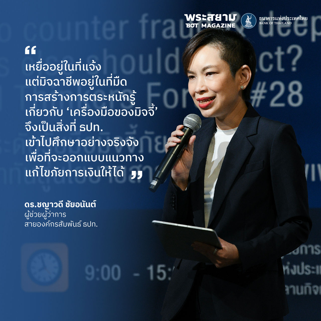 ดร.ชญาวดี ชัยอนันต์ ผู้ช่วยผู้ว่าการ สายองค์กรสัมพันธ์ ธปท. เน้นย้ำถึงพันธกิจสำคัญของ ธปท. ในการเดินเครื่องเต็มกำลังเพื่อออกมาตรการต่าง ๆ ในการป้องกันภัยคุกคามทางการเงินที่เกิดขึ้น ซึ่งต้องยอมรับว่ามีพัฒนาการที่รวดเร็วเพื่อหลบหลีกการตรวจจับและการป้องกันอยู่ตลอดเวลา ซึ่งเป็นอุปสรรคหนึ่งที่สำคัญต่อการเดินหน้าสู่เศรษฐกิจดิจิทัล
