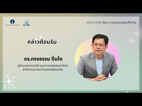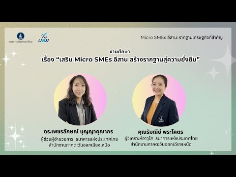 | 09.45 น. | นำเสนองานศึกษา “เสริม Micro SMEs อีสาน สร้างรากฐานสู่ความยั่งยืน” โดย ดร. เพชรลักษณ์ บุญญาคุณากร ผู้ช่วยผู้อำนวยการ และ คุณรัมณีย์ พระโคตร ผู้วิเคราะห์อาวุโส ธนาคารแห่งประเทศไทย สำนักงานภาคตะวันออกเฉียงเหนือ |