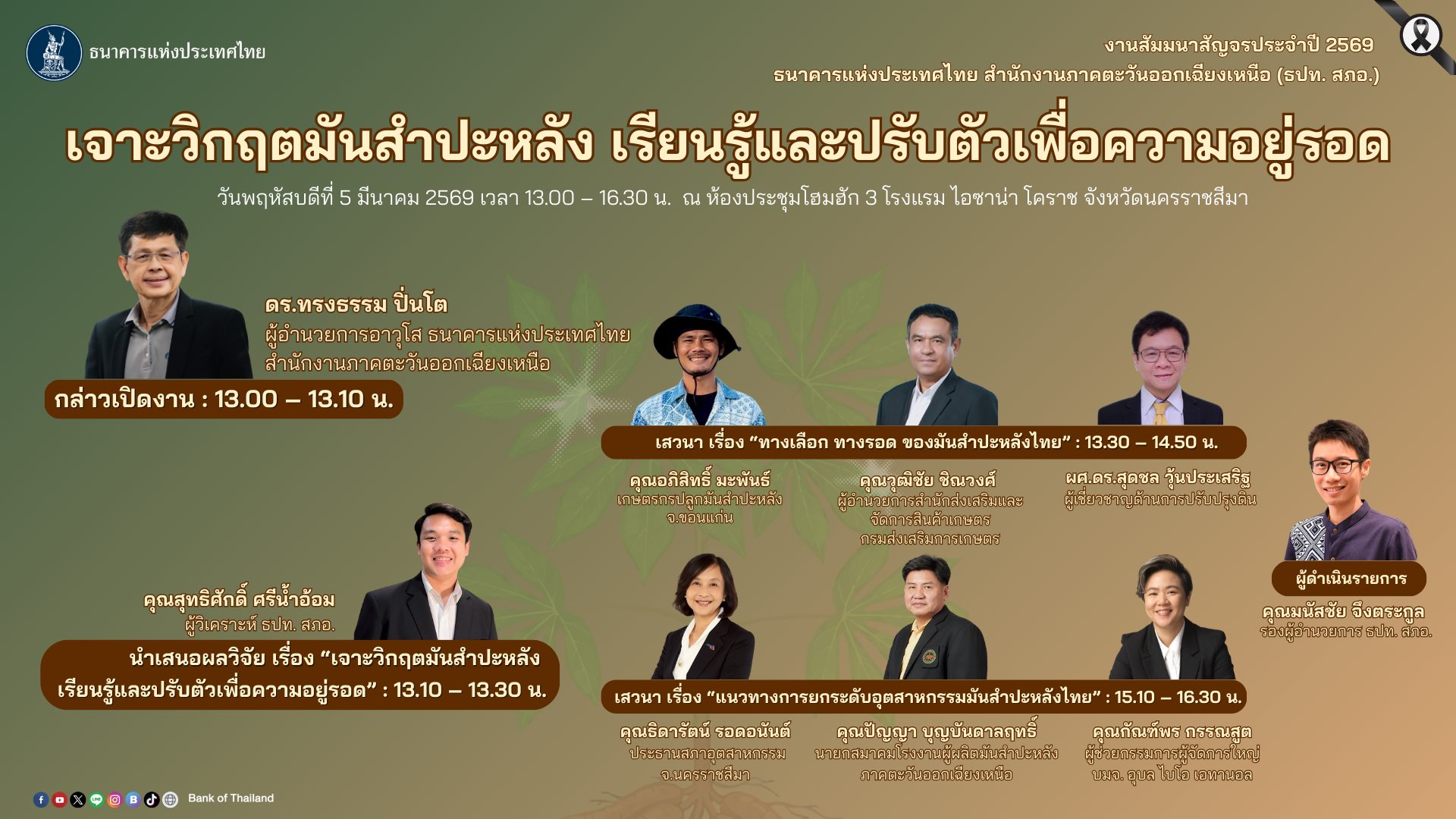 ธนาคารแห่งประเทศไทย สำนักงานภาคตะวันออกเฉียงเหนือ (ธปท. สภอ.) ขอเชิญชวนทุกท่านร่วมงานสัมมนาสัญจรประจำปี 2569 หัวข้อ “เจาะวิกฤตมันสำปะหลัง เรียนรู้และปรับตัวเพื่อความอยู่รอด” ในวันพฤหัสบดีที่ 5 มีนาคม 2569 เวลา 13.00-16.30 น. ณ ห้องประชุมโฮมฮัก 3 โรงแรม ไอซาน่า โคราช จังหวัดนครราชสีมา โดยจัดขึ้นเพื่อให้ผู้เข้าร่วมสัมมนาจากภาคส่วนต่าง ๆ ซึ่งประกอบด้วยกลุ่มเกษตรกร หน่วยงานภาครัฐ สถาบันการศึกษา และผู้ประกอบการที่เกี่ยวเนื่องกับอุตสาหกรรมมันสำปะหลัง ตลอดจนผู้สนใจทั่วไป ได้เข้าใจสถานการณ์วิกฤตมันสำปะหลัง พร้อมตัวอย่างการปรับตัว และแนวทางยกระดับอุตสาหกรรมมันสำปะหลังไทยอย่างยั่งยืน