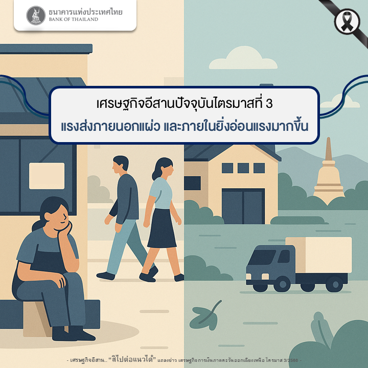 เศรษฐกิจอีสานปัจจุบันอยู่ในวังวนเศรษฐกิจที่มีสาเหตุสำคัญมาจากกำลังซื้อที่อ่อนแอ โดยในไตรมาสนี้เห็นอาการชัด จากการบริโภคภาคเอกชนที่หดตัวต่อเนื่องในทุกหมวดสินค้า โดยเฉพาะการบริโภคสินค้าไม่จำเป็นที่หดตัวมากในหมวดเครื่องดื่ม ขนมขบเคี้ยว และเครื่องสำอาง ซึ่งการจับจ่ายที่อ่อนแรงลงนี้ส่งผลให้การผลิตที่พึ่งพากำลังซื้อภายในประเทศหดตัว เช่นเดียวกับการผลิตเพื่อการส่งออกที่กลับมาหดตัวจากความต้องการจากคู่ค้าต่างประเทศที่ลดลง ขณะเดียวกันมุมมองของผู้ประกอบการต่อภาพเศรษฐกิจอีสานยังคงมีกังวล จึงชะลอการลงทุนใหม่ สะท้อนจากทิศทางการจดทะเบียนจัดตั้งโรงงานใหม่ที่ลดลง และแนวโน้มการลงทุนในเครื่องจักรและอุปกรณ์ที่หดตัวอย่างต่อเนื่อง ด้านรายได้ครัวเรือนมีความเปราะบางมากขึ้นทั้งในและนอกภาคเกษตร โดยรายได้เกษตรกรยังคงหดตัวจากราคาสินค้าเกษตรที่ปรับลดลงต่อเนื่อง แม้ผลผลิตจะยังขยายตัวดีจากสภาพอากาศที่เอื้ออำนวย ขณะที่ความเป็นอยู่ของแรงงานนอกภาคเกษตรมีความเสี่ยงมากขึ้น จากตลาดแรงงานที่ตึงตัว ธุรกิจไม่ปลดแรงงาน แต่ก็ไม่จ้างแรงงานใหม่เพิ่ม จากปัจจัยทั้งหมดนี้เกิดเป็นวังวนที่เศรษฐกิจอีสานหาทางออกได้ยาก