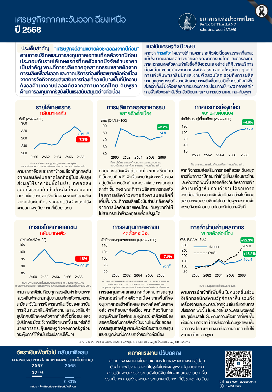 คาดว่า “ทรงตัว” โดยรายได้เกษตรกรหดตัวต่อเนื่องตามราคาที่ลดลงแม้ปริมาณผลผลิตยังขยายตัว ขณะที่การบริโภคและการลงทุนภาคเอกชนหดตัวตามกำลังซื้อที่ยังอ่อนแอ อย่างไรก็ดี ภาคบริการท่องเที่ยวขยายตัวจากการจัดกิจกรรมขนาดใหญ่ต่าง ๆ อาทิ การแข่งขันพาราลิมปิกและงานพืชสวนโลก รวมถึงการผลิตภาคอุตสาหกรรมที่ขยายตัวตามการผลิตชิ้นส่วนอิเล็กทรอนิกส์เพื่อส่งออก ทั้งนี้ ยังต้องติดตามกระบวนการงบประมาณปี 2570 ที่อาจล่าช้า การฟื้นตัวของกำลังซื้อครัวเรือน และสถานการณ์ชายแดนไทย-กัมพูชา