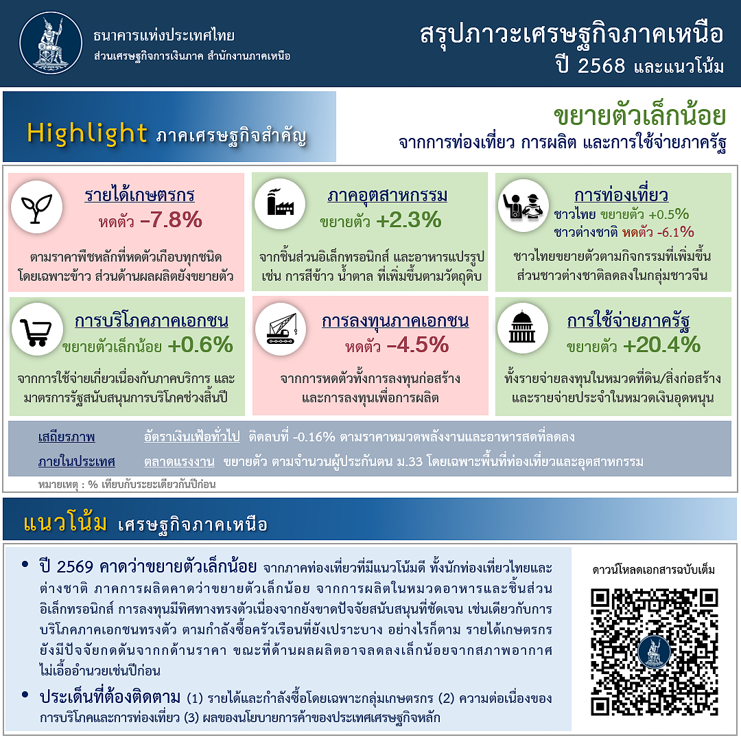 แนวโน้มปี 2569 คาดว่าขยายตัวเล็กน้อย จากภาคท่องเที่ยวที่มีแนวโน้มดีทั้งนักท่องเที่ยวไทยและต่างชาติ ภาคการผลิตคาดว่าขยายตัวเล็กน้อย จากการผลิตในหมวดอาหารและชิ้นส่วนอิเล็กทรอนิกส์ การลงทุนมีทิศทางทรงตัวเนื่องจากยังขาดปัจจัยสนับสนุนที่ชัดเจน เช่นเดียวกับการบริโภคภาคเอกชนทรงตัว ตามกำลังซื้อครัวเรือนที่ยังเปราะบาง อย่างไรก็ตาม รายได้เกษตรกรยังมีปัจจัยกดดันจากด้านราคา ขณะที่ด้านผลผลิตอาจลดลงเล็กน้อยจากสภาพอากาศไม่เอื้ออำนวยเช่นปีก่อน